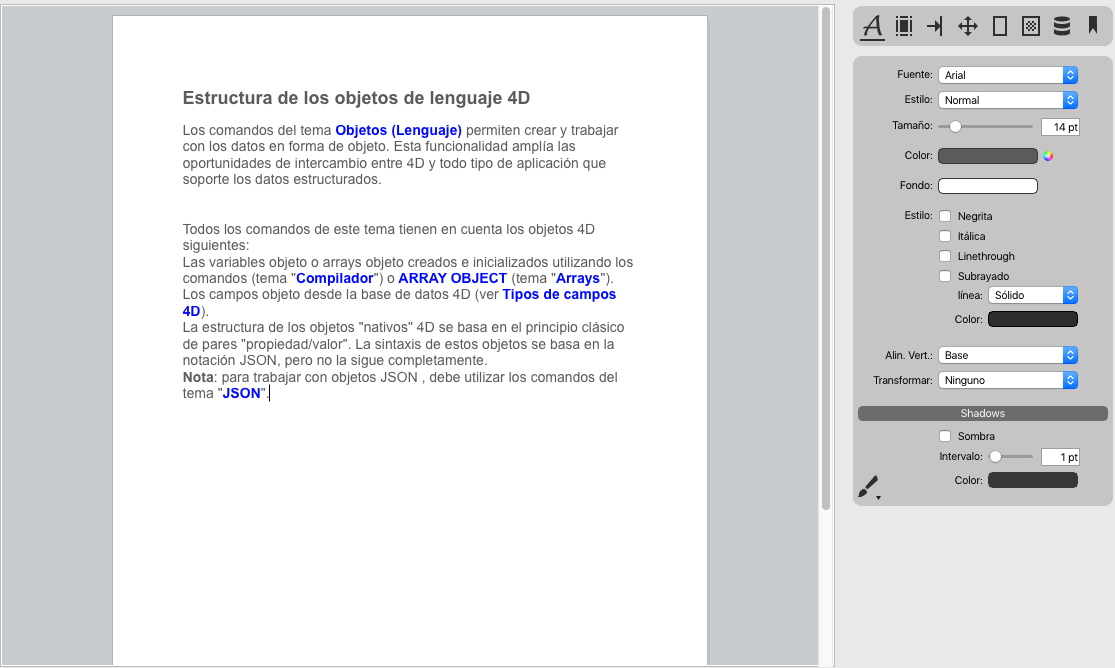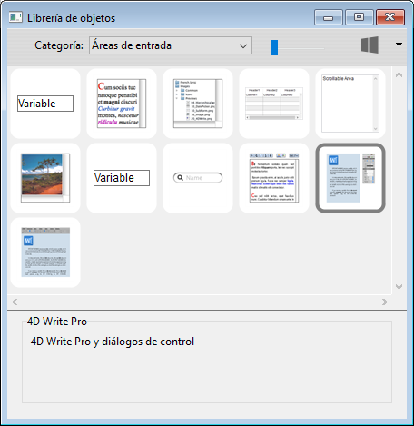 En 4D, los documentos 4D Write Pro se pueden mostrar y editar manualmente en un objeto formulario 4D, llamado 4D Write Pro. Este objeto está disponible como parte de la última herramienta (Área de plug-in, área Web, etc.) de la barra de objetos