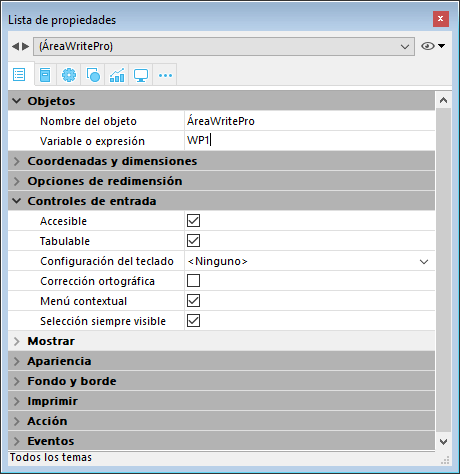 Un área de formulario 4D Write Pro form se configura por medio de las propiedades estándar de la Lista de propiedades, tales como nombre del objeto y nombre de la variable, coordenadas, entrada, visualización y apariencia, y/o eventos.