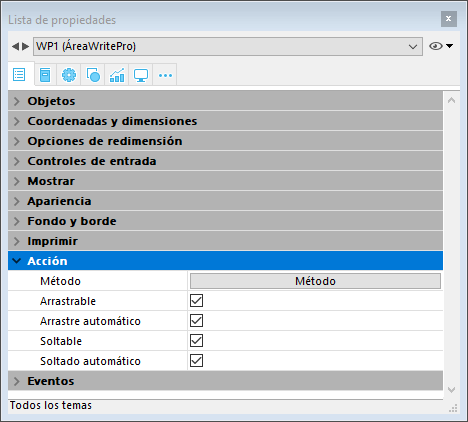 Para configurar las funcionalidades de arrastrar y soltar para sus áreas 4D Write Pro, es necesario seleccionar las opciones adecuadas en el tema "Acción" de la Lista de propiedades: