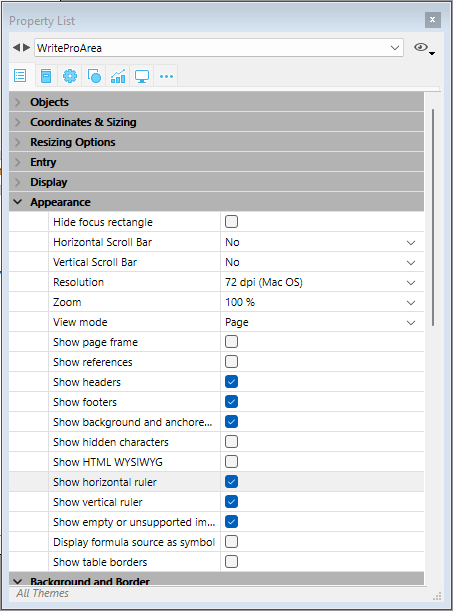 La configuración de vista del documento se manejan a través de temas específicos en el tema Apariencia de la lista de propiedades para objetos de formulario 4D Write Pro: