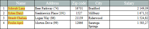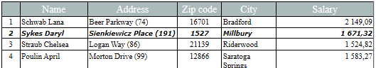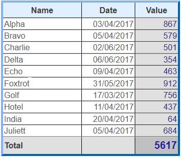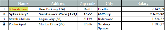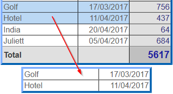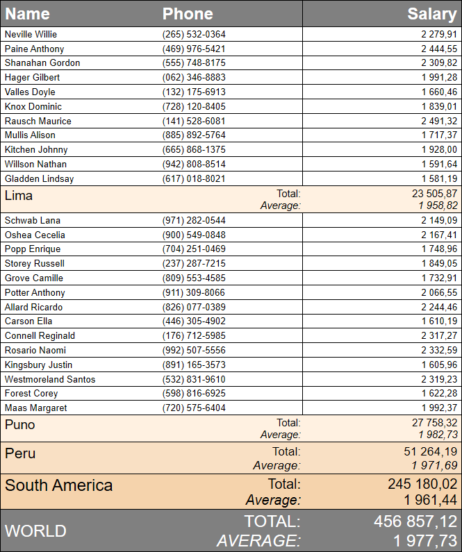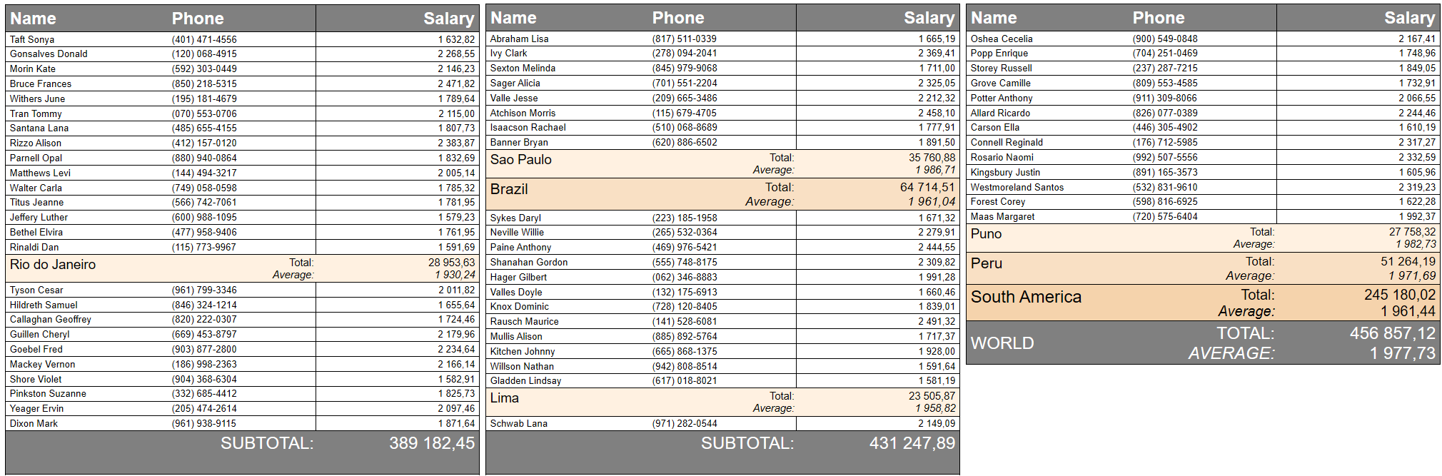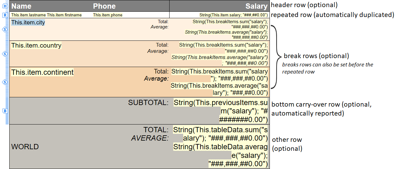 Cada vez que mudar o valor da fórmula, se insere uma nova linha de ruptura. Portanto, para que as tabelas se mostram corretamente, a seleção de entidades (ou coleção) utilizada como fonte de dados da tabela deve estar ordenada em consequencia. Por exemplo, se quiser desgloses por países e cidades, a fonte de dados deve ser ordenada do seguinte modo: ds.people.all().orderBy("country asc, city asc")