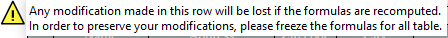 Entretanto, lembre que se a fonte de dados da tabela voltar a ser calculada, qualquer modificação realizada nas linhas calculadas (exceto na primeira linha, ver a seguir) é perdida. Por outro lado, como a primeira linha é a linha da planilha, qualquer modificação realizada nesta linha se propagará a todas as linhas se voltar a calcular a fonte de dados da tabela. O mesmo é válido para quebra de linhas, qualquer modificação feita em quebras de linhas é perdida, exceto para quebras de linha template (que estao localizadas no final ou começo da tabela).