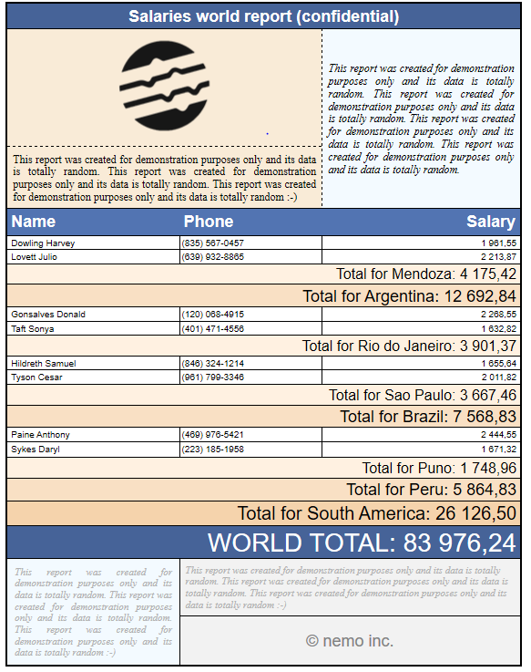 Graças à expressão This.breakItems pode utilizar esta funcionalidad,e por exemplo, para mostrar a media total das linhas repetidas dentro de una linha de interrupção. breakItems é um subconjunto avaliado da fonte de dados da tabela, seja uma seleção de entidades se a fonte de dados da tabela for uma seleção de entidades, ou uma coleção se a fonte de dados for uma coleção. Assim, dentro de uma linha de ruptura, pode escrever: This.breakItems.sum("salario")