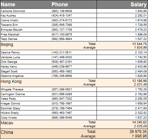 フォーミュラの値が変わるたびに、新しいブレーク行が挿入されます。そのため、表が正確にレンダリングされるためには、表のデータソースとして使用されているエンティティセレクション(またはコレクション)は適切にソートされている必要があります 。例えば、国ごとおよび都市ごとにブレーク行を挿入したい場合、データソースは以下のように指定されている必要があります: ds.people.all().orderBy("country asc, city asc")