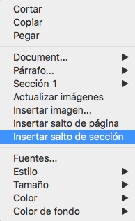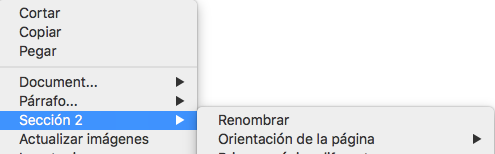 Cuando se ha añadido una ruptura de sección, el menú contextual muestra un número incrementado para cada sección. Sin embargo, puede cambiar el nombre de cualquier sección: