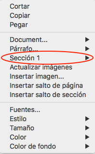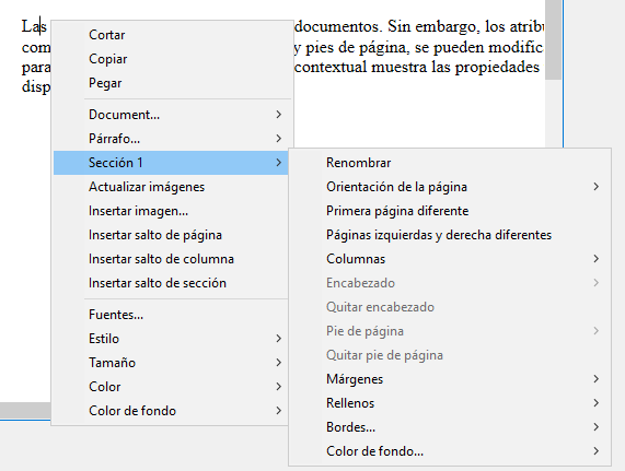 Las secciones heredan atributos de los documentos. Sin embargo, los atributos de documentos comunes, incluyendo los encabezados y pies de página, se pueden modificar por separado para cada sección. El menú emergente contextual muestra las propiedades y atributos disponibles en el nivel de sección: