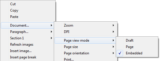 Embebido: modo de vista conveniente para áreas anidadas; no muestra márgenes, pies de página, encabezados, columnas, marcos de página, etc. Este modo también se puede utilizar para producir una salida de vista como Web (si selecciona también la resolución 96 dpi y la opción HTML WYSIWYG).