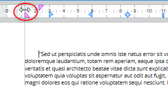 Puede modificar márgenes izquierda y derecha, indentaciones y posiciones de tabulación haciendo clic y arrastrando los símbolos correspondientes en la regla horizontal:
