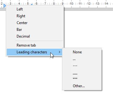 Los caracteres iniciales siempre aparecen antes de la tabulación y siguen la dirección del texto (de izquierda a derecha o de derecha a izquierda). Se pueden definir por programación con los comandos WP SET ATTRIBUTES, WP GET ATTRIBUTES y WP RESET ATTRIBUTES utilizando wk leading con los selectores wk tab default o wk tabs, o vía el menú contextual de regla horizontal (como se muestra a continuación).