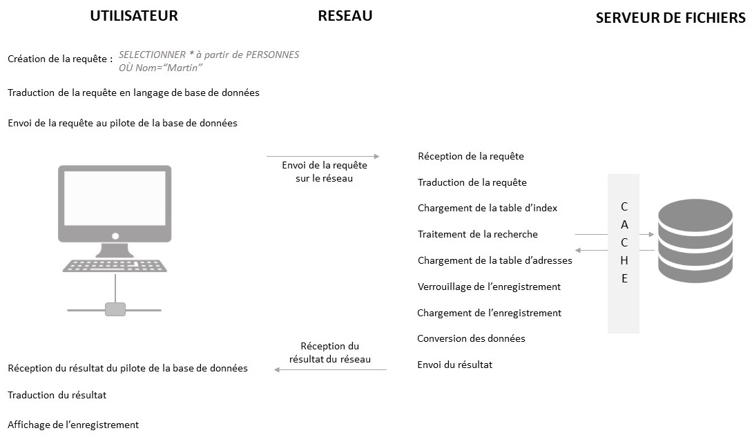 Dans le modèle du partage de fichiers, chaque station de travail effectue en local toutes les actions de modification sur les données. Cela a pour conséquence de créer un trafic réseau très important, car chaque requête nécessite de nombreuses communications à travers le réseau. Le schéma suivant présente un exemple de trafic réseau généré lorsqu'un utilisateur recherche chaque personne dont le nom est “Smith”.