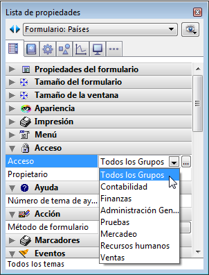 La Lista de propiedades y la ventana “Propiedades del formulario” incluyen listas de Acceso y Propietario: