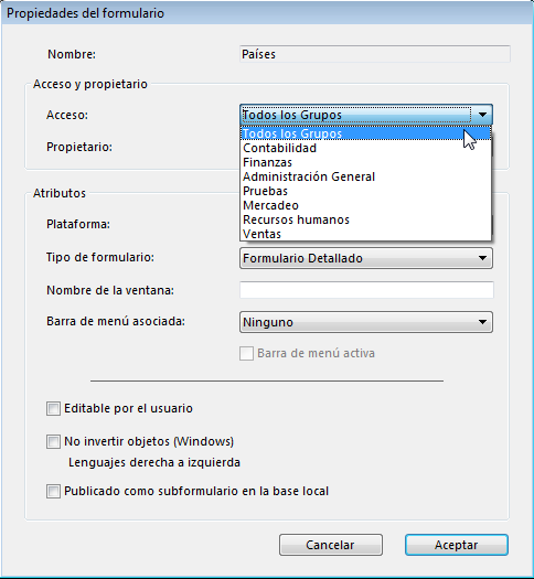 Si no elije un grupo, todos los grupos tendrán los privilegios de propietario para el formulario (por defecto).