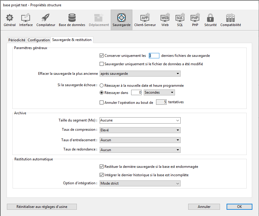 Les options de sauvegarde sont définies dans la ST FIXER ATTRIBUTS des Propriétés de la base :