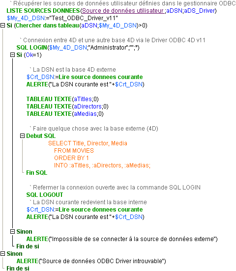 Comme vous pouvez le constater, dans la première partie de la méthode nous effectuons une requête sur la base interne. Puis, dans la seconde partie, nous nous connectons à l'autre base 4D via le driver ODBC et effectuons la même requête. Le résultat obtenu dans les deux cas est identique, bien entendu.