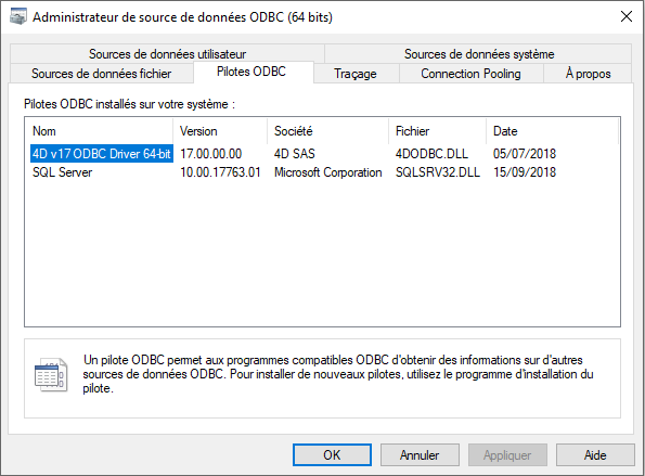 5. Installez le pilote "4D ODBC Driver for 4D" puis vérifiez qu'il apparaît bien dans la boîte de dialogue d'administration de sources de données ODBC :