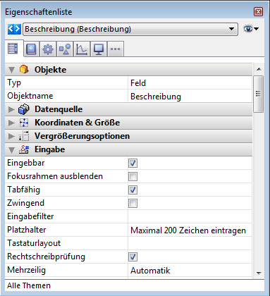 Dieses Attribut lässt sich in der Eigenschaftenliste unter dem Thema “Eingabe” für aktive Objekte (eingebbar oder nicht-eingebbar) sowie für nicht-eingebbare Felder setzen.