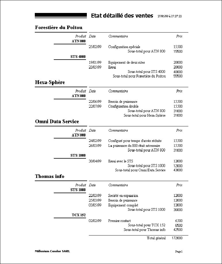 Dans cet exemple, l’en-tête de la page contient le titre de l’état, ainsi que la date et l’heure d’impression. Les zones de ruptures d’en-têtes de niveau 1 contiennent le nom des sociétés, les zones de ruptures d’en-têtes de niveau 2 contiennent celui des produits. Les zones de corps contiennent les données directement extraites des enregistrements. Les zones de ruptures de niveau 2 contiennent les sous-totaux des produits vendus à chaque société. Les zones de ruptures de niveau 1 contiennent les sous-totaux pour chacune des sociétés et la zone de rupture de niveau 0 contient le total des ventes.