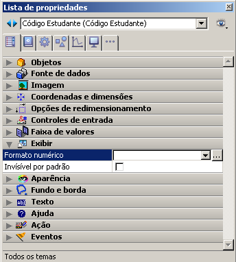 Neste caso, o formato não pode ser modificado nas propriedades do objeto. É possível acessar ao editor clicando no botão [...] localizado a direita do combo box de formatos. Os formatos ou filtros personalizados aparecem ao início das listas de formatos numéricos e alfanuméricos, precedidos por uma barra vertical (|).