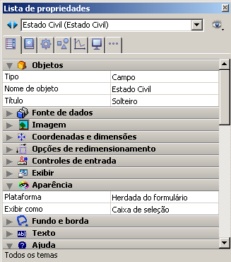 Selecione a opção Caixa de seleção da lista “Mostrar como” no tema “Aparência”. Uma vez que você tenha selecionado esta opção, se mostra uma área de entrada “Título” no tema “Objetos”. Esta é a área de entrada na qual se introduz a etiqueta da caixa de seleção. Por padrão, o nome do campo é o nome da etiqueta.