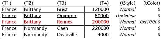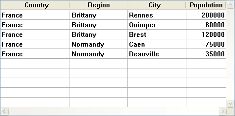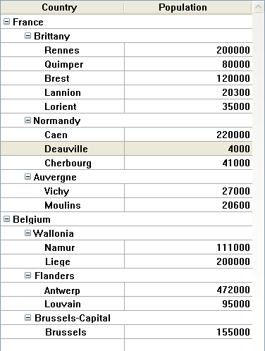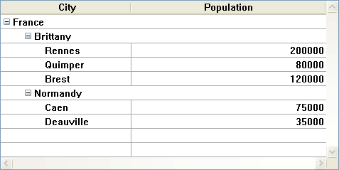 A break row and a hierarchical "node" are automatically added in the list box when values are repeated in the arrays. For example, imagine a list box containing four arrays specifying cities, each city being characterized by its country, its region, its name and its number of inhabitants:
