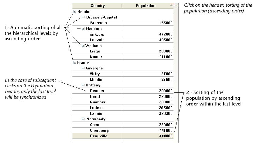 • During subsequent sorts carried out on non-hierarchical columns of the list box, only the last level of the first column is sorted. It is possible to modify the sorting of this column by clicking on its header.
