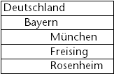 Beim Anzeigen in hierarchischer Form erscheint der Eintrag "Freising" nicht in der zweiten, sonderen in der vierten Zeile, weil zwei Umbruchzeilen hinzugefügt werden: