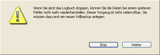 Diese Vorsichtsmaßnahme ist notwendig, denn, damit Sie die Datenbank nach einem Zwischenfall wiederherstellen können, benötigen Sie eine Kopie der Datenbank, in die Sie die im Logbuch gespeicherten Operationen integrieren können. Ab jetzt werden alle Operationen in den Daten im Logbuch mitgeschrieben. Dieses wird in Zukunft immer zusammen mit der Datenbank verwendet