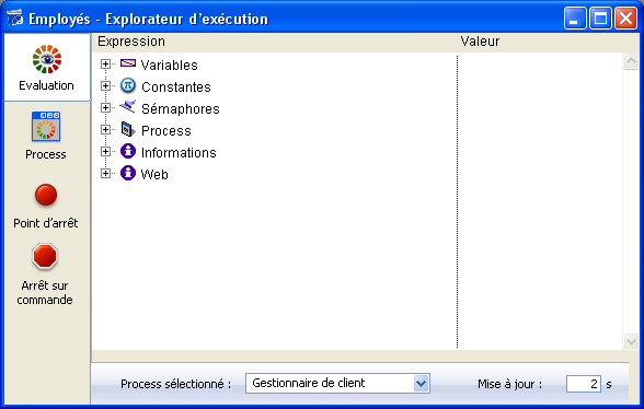 La fenêtre se compose de quatre pages, accessibles via les boutons correspondants : Evaluation, Process, Point d’arrêt et Arrêt sur commande. Le fonctionnement de l'Explorateur d'exécution sur 4D Server est identique à celui de 4D. Pour plus d'informations, reportez-vous au manuel Mode Développement.