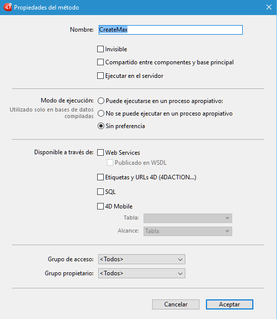 Aparece la ventana “Propiedades del método”, permitiéndole modificar el nombre así como las otras propiedades del método.