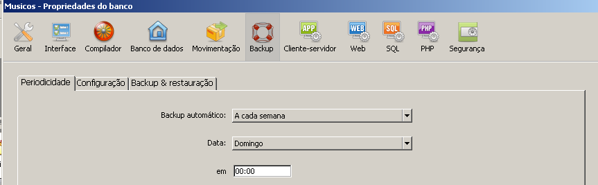 As opções que se encontram nesta aba lhe permitem definir e configurar os backups periódicos automáticos do banco de dados. Pode escolher um parâmetro padrão rápido ou personalizar completamente a periodicidade.