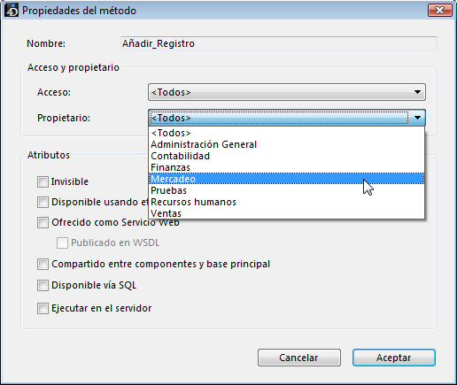 El siguiente ejemplo muestra los privilegios de acceso “Propietario” del método de proyecto Añadir_Registro asignados a un grupo. Los grupos pueden generalmente pueden tener derechos de “Acceso” (uso) y/o “Propietario” (modificación).