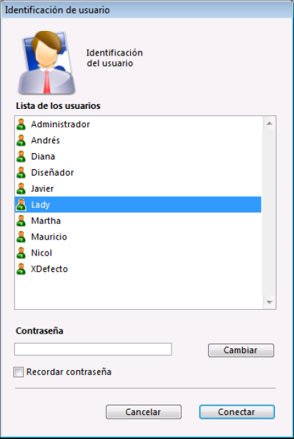 • Si no hay una contraseña asignada para el usuario por defecto, no se muestra la caja de diálogo. Cada usuario, en este caso, tiene los mismos privilegios y restricciones de acceso definidos para el usuario por defecto.