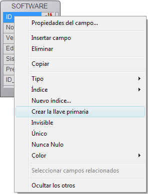 Haga clic derecho y seleccione Crear la llave primaria en el menú contextual (este comandosólo se muestrapara los camposcuyo tipo eselegible parallaves primarias): No puede tener más de una llave primaria para cada tabla. Si ya se ha especificado una llave primaria, aparecerá un caja de diálogo de alerta indicando que se desactivará la llave primaria existente.