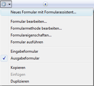 Sie können vorhandene Formulare über die entsprechenden Befehle des Kontextmenüs oder des Menüs Optionen am unteren Rand kopieren und einfügen, sowie duplizieren. Auf diese Weise können Sie rasch und problemlos mehrere Formulare mit denselben Merkmalen entwickeln.
