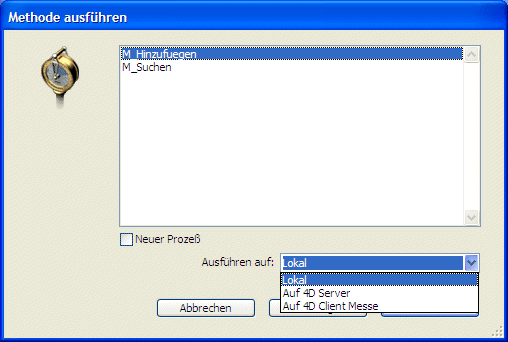 Mit 4D im lokalen Modus können Sie beim Verwenden einer Routine, z.B. New process einen Benutzerprozess starten, in dem eine Methode abläuft. Diese Methode heißt Prozessmethode. Weitere Informationen dazu finden Sie im Handbuch 4D Programmiersprache im Abschnitt Projektmethoden.