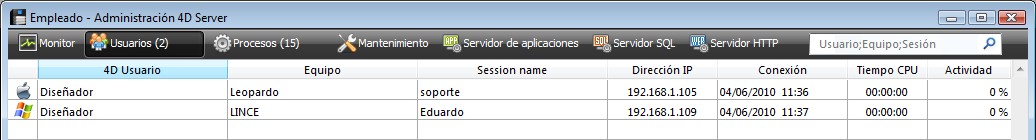 Para este tutorial, nos conectaremos a la base servidor con un 4D remoto en Windows y un 4D remoto en Mac OS. Tan pronto como se establezca la conexión, podrá ver al segundo usuario en la ventana de administración de 4D Server (la primera columna indica el sistema operativo del equipo remoto):