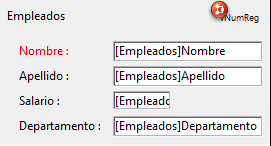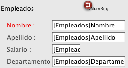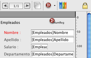 En la primera máquina, seleccione la etiqueta "Apellido" a la izquierda del campo [Empleados]Nombre. Seleccione en el menú jerárquico Objeto>Color. Vuelve rojo el color de este objeto.