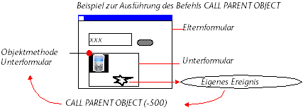 Über den Befehl EXECUTE METHOD IN SUBFORM kann ein Formular oder eins seiner Objekte die Ausführung einer Methode im Kontext der Unterformular Instanz anfordern, was Zugriff auf Variablen, Objekte, etc. des Unterformulars gibt. Diese Methode kann auch Parameter empfangen. Nachfolgendes Schema zeigt die Funktionsweise: