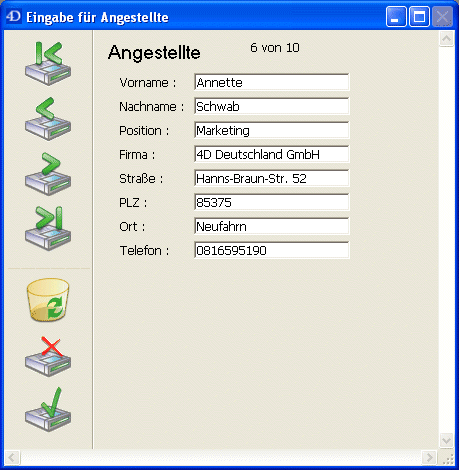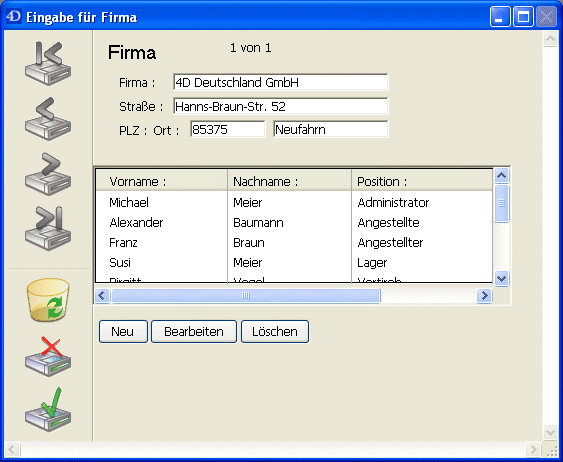Umgekehrt, wenn in der Tabelle [Firma] ein Datensatz aktuell wird, erstellt 4D eine Auswahl von Datensätzen der Tabelle [Angestellte] und zeigt diese im Formular. Da die Verknüpfung mehrere Datensätze der anderen Tabelle angibt, können Name und Position vieler Angestellter angezeigt werden. Nur die aktuell im Formular angezeigten Datensätze werden in den Speicher geladen.