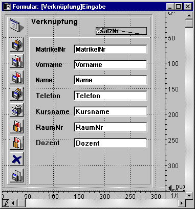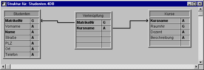 Die Tabelle [Studenten] ist eine Eine-Tabelle. Sie enthält einen Datensatz für jeden Studenten, Namen, und Anschrift. Das Datenfeld MatrikelNr bestimmt jeden Studenten eindeutig. Die Tabelle [Kurse] ist ebenfalls eine Eine-Tabelle. Sie enthält einen Datensatz für jeden Kurs, mit dem Kursnamen und dem Dozenten. Das Datenfeld Kursname bestimmt jeden Kurs eindeutig. Eine Zwischentabelle, nämlich [Verknüpfung] ist für beide anderen Tabellen die Viele-Tabelle. Sie enthält Datensätze für viele Studenten und für viele Kurse. Formulare dieser Tabelle werden für die Eingabe von Daten in beide anderen Tabellen benutzt und für die Anzeige von Informationen in jeder der anderen Tabellen. Mit Hilfe der drei Tabellen werden die Daten effizient gespeichert. Der komplette Datensatz eines Studenten wird nur einmal gespeichert. Zu jedem Kurs gehört ein Datensatz, nur einmal gespeichert. Die Datensätze, die Studenten mit Kursen verknüpfen, werden für jede Einschreibung einmal gespeichert. Sämtliche Informationen stehen aber in jeder beliebigen Zusammenstellung zur Verfügung.