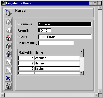Im obigen Beispiel für Unterformulare können Sie in jedes der Datenfelder Datensätze eingeben. Wenn Sie z.B. in einen Kursdatensatz einen neuen Studenten eingeben wollen, setzen Sie den Tabulator auf den letzten in dem Unterformular gezeigten Studentendatensatz und drücken unter Windows die Tastenkombination Strg+Shift+/, auf Mac OS Befehl+Shift+/, um einen neuen Datensatz zu erstellen (Sie können diese Tastenkombination in den Datenbank-Eigenschaften ändern, siehe ). Wenn Sie den passenden Kursnamen eingeben, werden die weiteren Informationen in dem Datensatz erstellt.