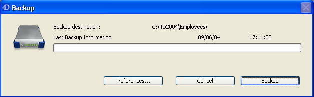 The Cancel button interrupts the back-up process. For more information about back-up configuration, refer to the Design Reference manual of the 4D documentation.