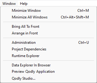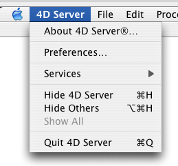 The interface of the 4D Server application is made up of the following menus: File, Edit, Window, Help. Under Mac OS, certain commands are found in the 4D Server menu (application menu).