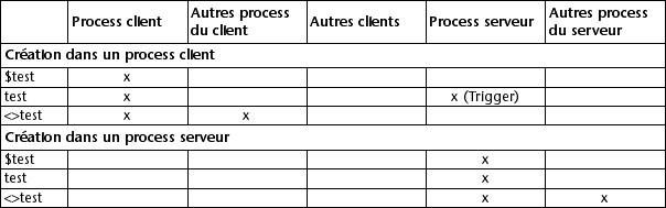 • Ensembles/Sélections temporaires process : Un objet process n'est "visible" que par le process dans lequel il a été créé et, s'il a été créé dans un process client, par le process "jumeau" créé sur le serveur. Les ensembles process sont effacés à la fin de l'exécution de la méthode process. Le nom des objets process ne comporte aucun préfixe particulier.