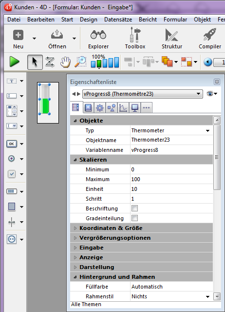 Fügt einen vertikalen Ablaufbalken mit einer numerischen Variablen hinzu mit dem jeweiligen Mindest- und Maximumwert 0 und 100. Sie können diese Werte über die Eigenschaftenliste verändern.