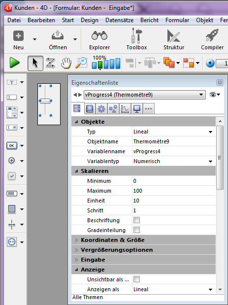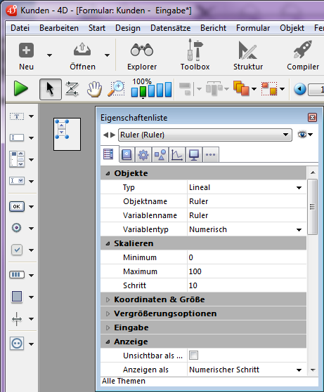 Fügt ein horizontales Lineal mit Skala und numerischer Variable hinzu mit dem jeweiligen Mindest- und Maximumwert 0 und 100. Sie können diese Werte über die Eigenschaftenliste verändern.
