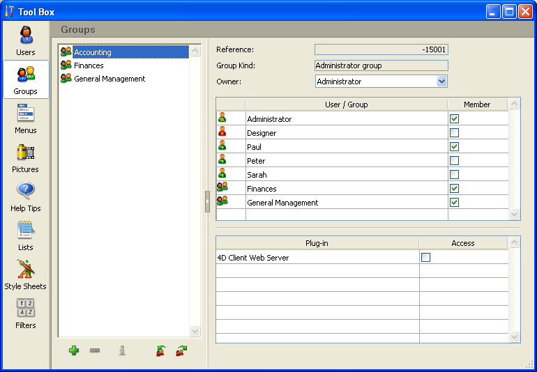 - The integrated SQL server of 4D. For more information about access groups for the integrated SQL server of 4D, refer to Configuration of 4D SQL Server in the 4D SQL Reference manual.
