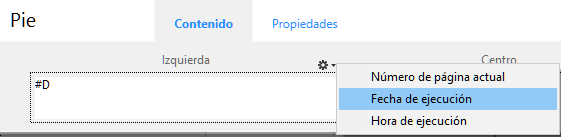 En las áreas Izquierda, Centro y/o Derecha, puede introducir información que debe incluirse en el informe. Puede insertar el número de página, así como también la fecha y/o hora de la ejecución en el encabezado o pie de página del informe. Hay un menú local que aparece arriba de cada área de entrada que permite insertar variables: