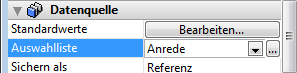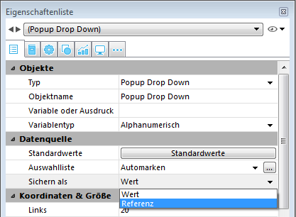 Unter der Gruppe "Datenquelle" gibt es die Option Sichern als Wert/Referenz für Objekte vom Typ Feld und Variable und PopUp-Menüs, Dropdown-Listen, sowie für Spalten von Listboxen (siehe Eigenschaften für Spalten der Listbox):