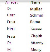 Sie wollen ein Feld zum Klassifizieren von Personen anlegen: Herr, Frau, aber auch Dr., Ing., Dipl-Ing., etc. Dafür erstellen Sie ein Feld vom Typ Lange Ganzzahl mit Namen "Anrede", definieren eine Auswahlliste (genannt "Anreden") mit den möglichen Titeln und weisen sie dem Feld zu.